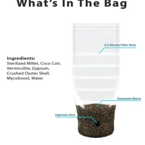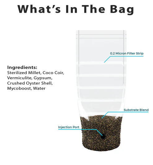 Sterilized Millet, Coco Coir, Vermiculite, Gypsum, Crushed Oyster Shell, Mycobost, Water